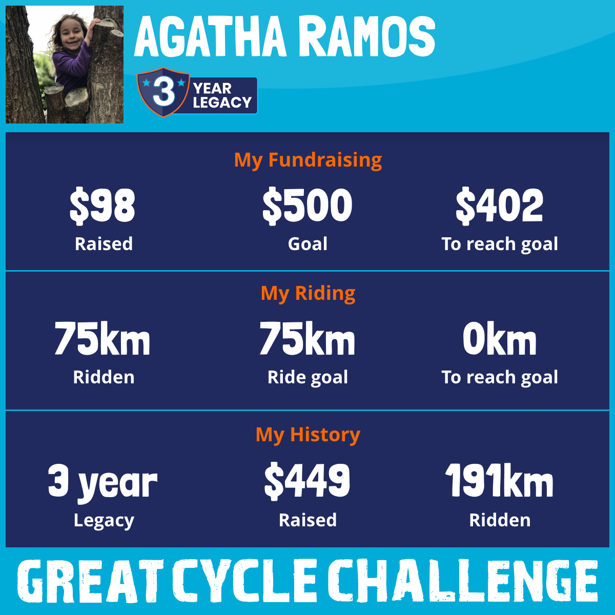 And so I am riding and raising funds to support the Children's Medical Research Institute to continue their work into the prevention, diagnosis, treatment and finding a cure for childhood cancer.