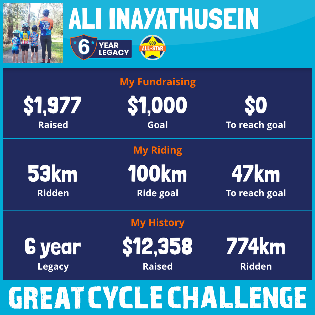 Last year, my daughters Munira & Naqiyah, son Taha and I took part in the Great Cycle Challenge to fight kids' cancer - Over the last 5 years, we have raised over $10,000 and cycled more than 700km. This year we are riding again with the support of friends and family.