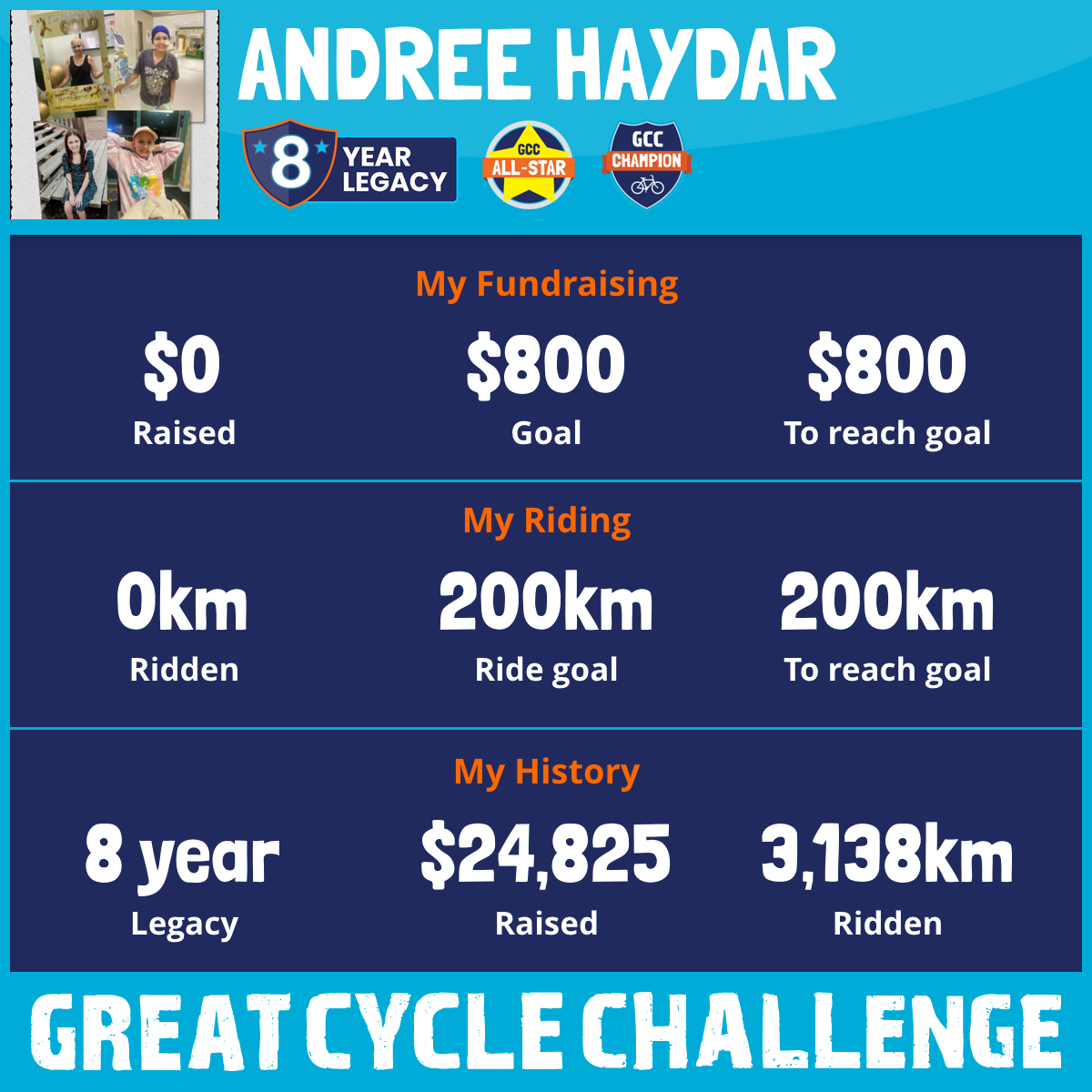 It's that time of the year again, I am taking part in the Great Cycle Challenge to fight kids' cancer! for the past 7 years I have ridden 2,932 km and thanks to the generosity of my amazing Family & Friends I have raised $20,246!
