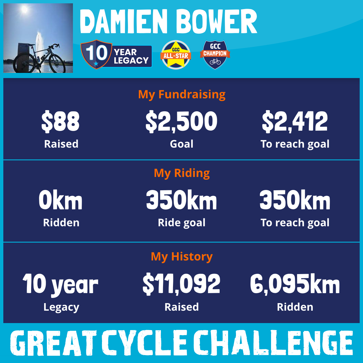 15 Oct 2025Well I am half way through this year's challenge. So far I have raised $1703 and ridden 128.8km. Another planned ride after work to take me over the 150km mark. Please if you can donate please click on the link and get behind this amazing cause