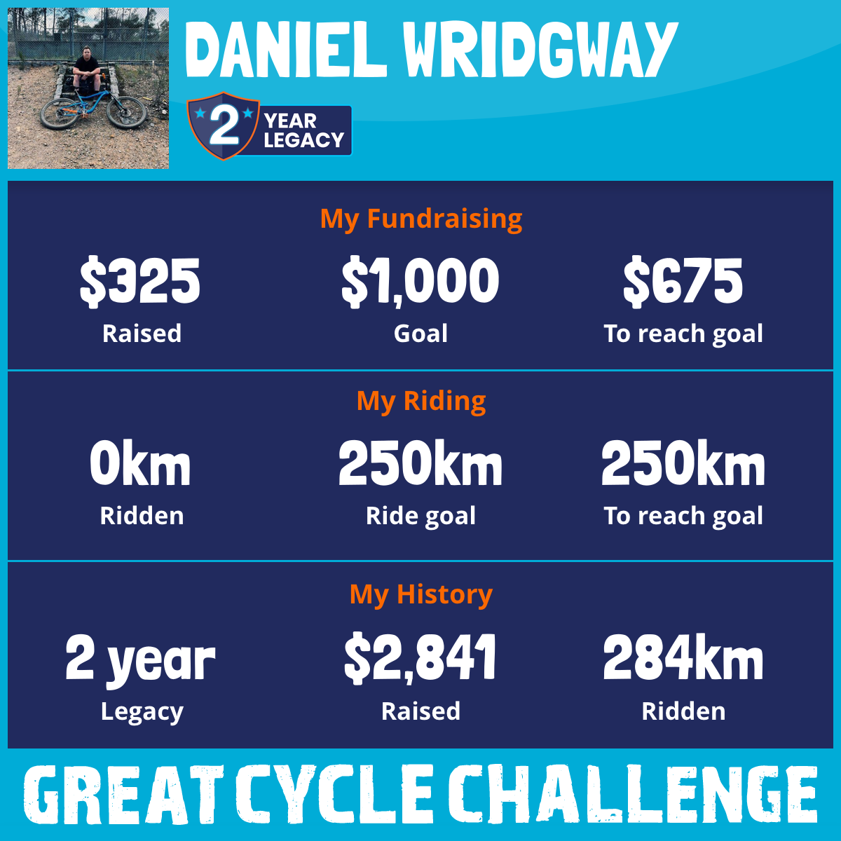 Every year, over 700 children are diagnosed with cancer in Australia, and sadly, 3 kids lose their battle each week. That’s why I’m riding 250km – to help fight this devastating disease. I'll be away with my family for part of the month, so I’m squeezing the challenge into just 20 days.