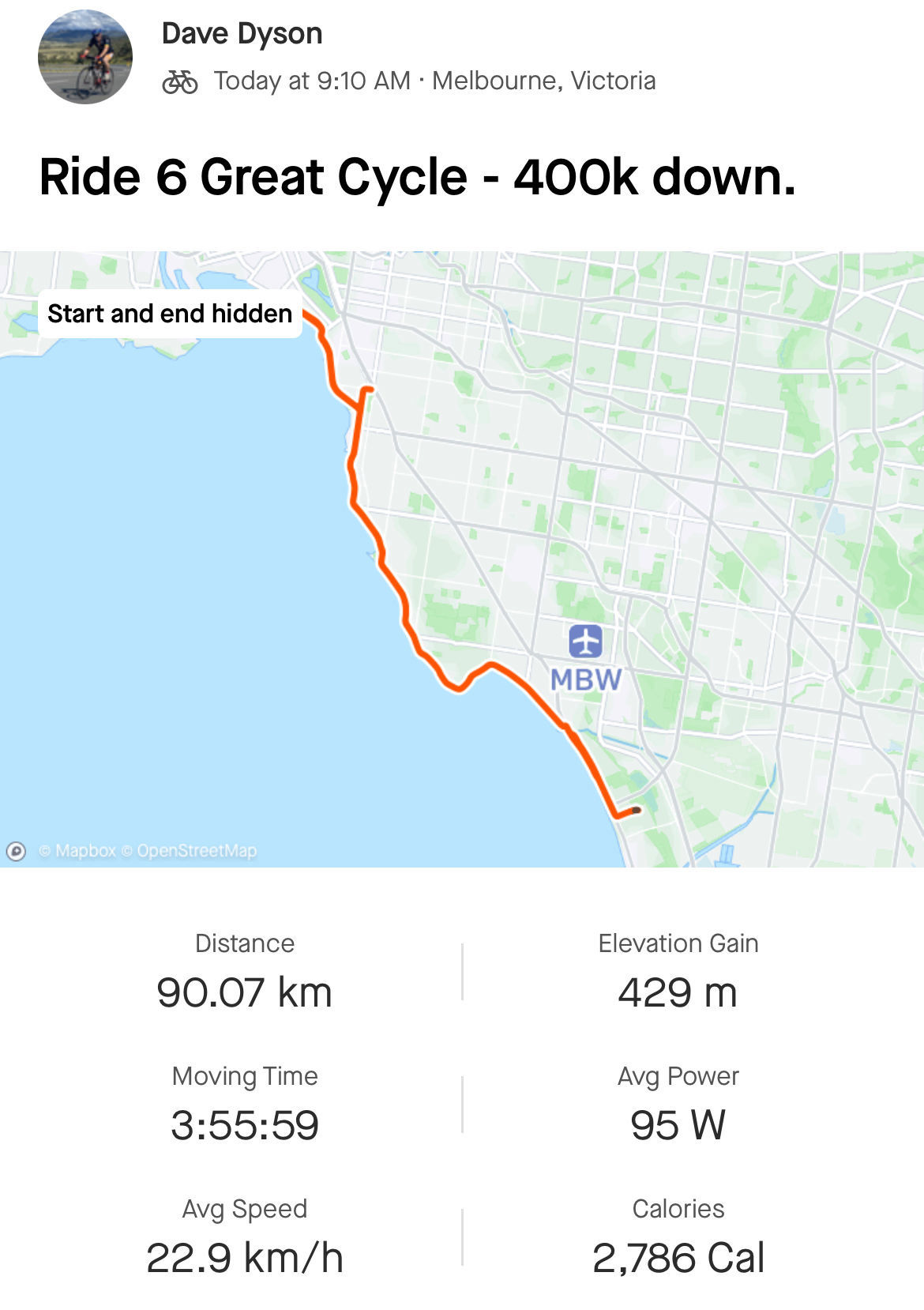 90.1 km ride - Ride 6 - 401k done - Saturday, October 18, 2025