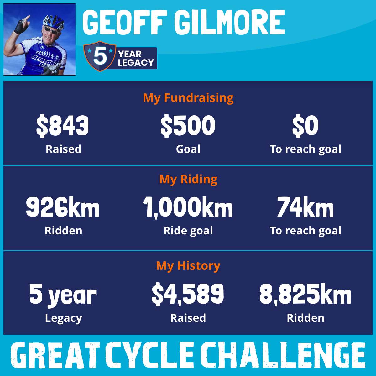 “Very worthy cause Geoff, all the best for your 5th year riding to support this event. Stay safe on those roads! 🚴‍♂️ 😊💕”