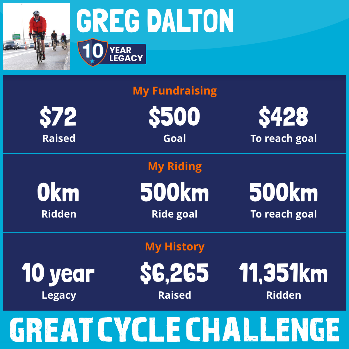 This October, I am again taking part in the Great Cycle Challenge to fight kids' cancer! This year is my tenth year of The Great Cycle Challenge. This year I am starting slowly as I am currently rehabilitating following total knee replacement in April. But I should achieve my cycling goal and my donation goal.