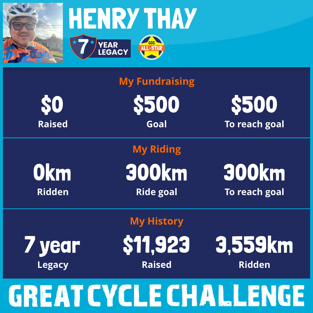 And so I am riding and raising funds to support the Children's Medical Research Institute to continue their work into the prevention, diagnosis, treatment and finding a cure for childhood cancer.