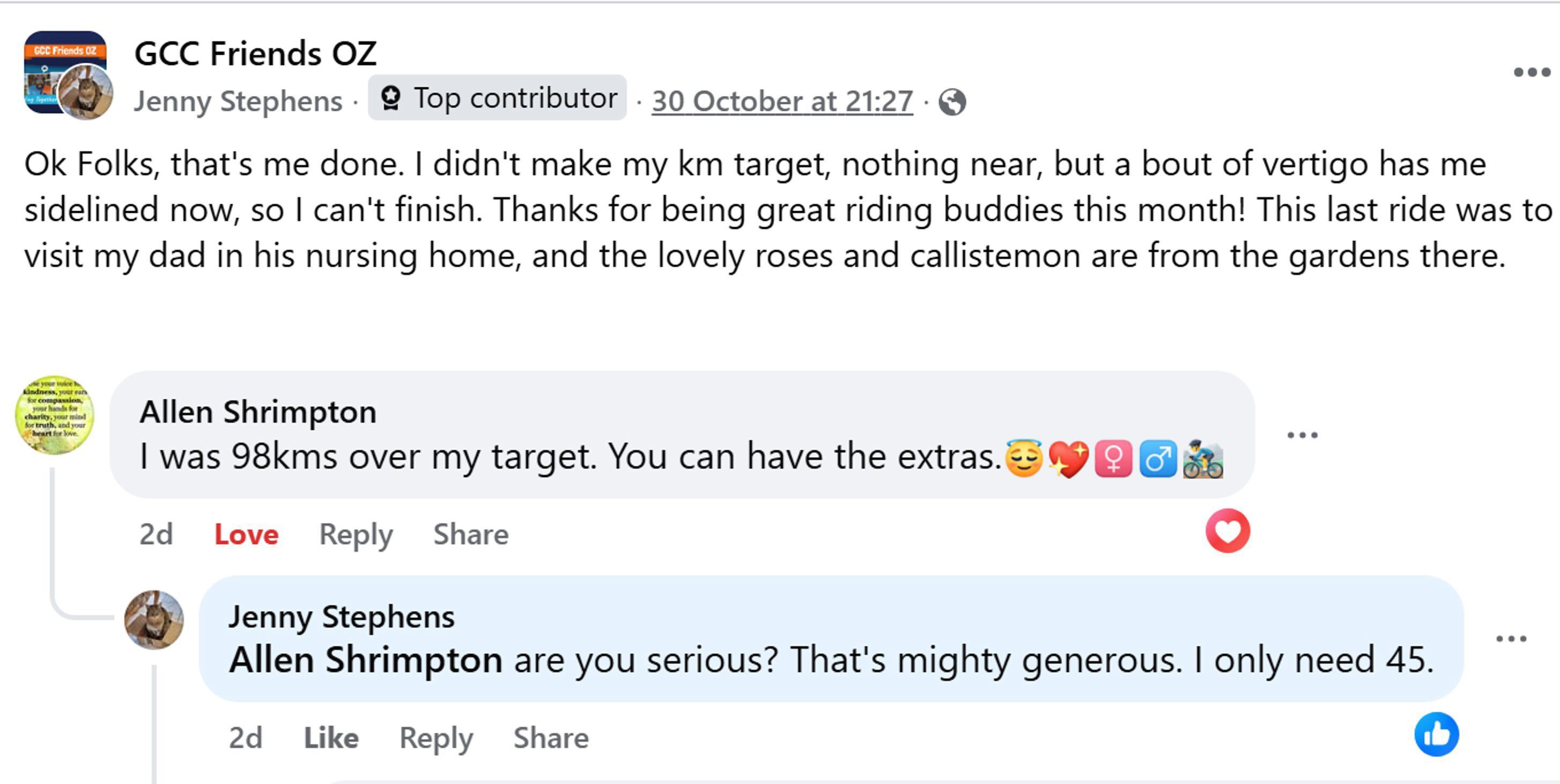 46.2 km ride - Donated kms from Allen Shrimpton - Monday, November 3, 2025