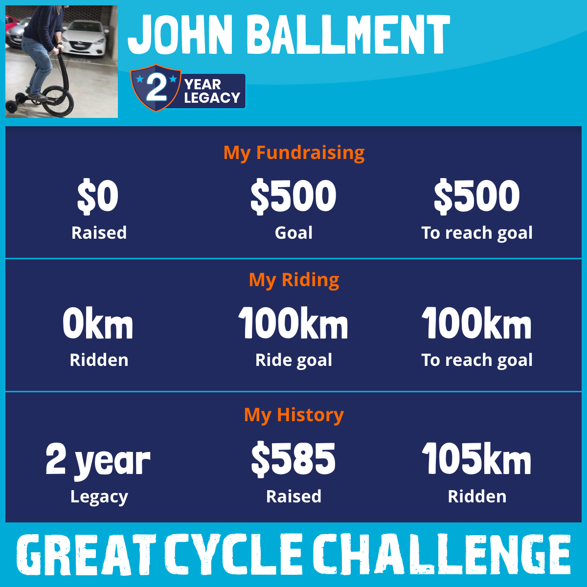 My challenge to the community is that if I raise over $2,500 I will ride the half-bike (https://halfbikes.com/) for 10km during the month.