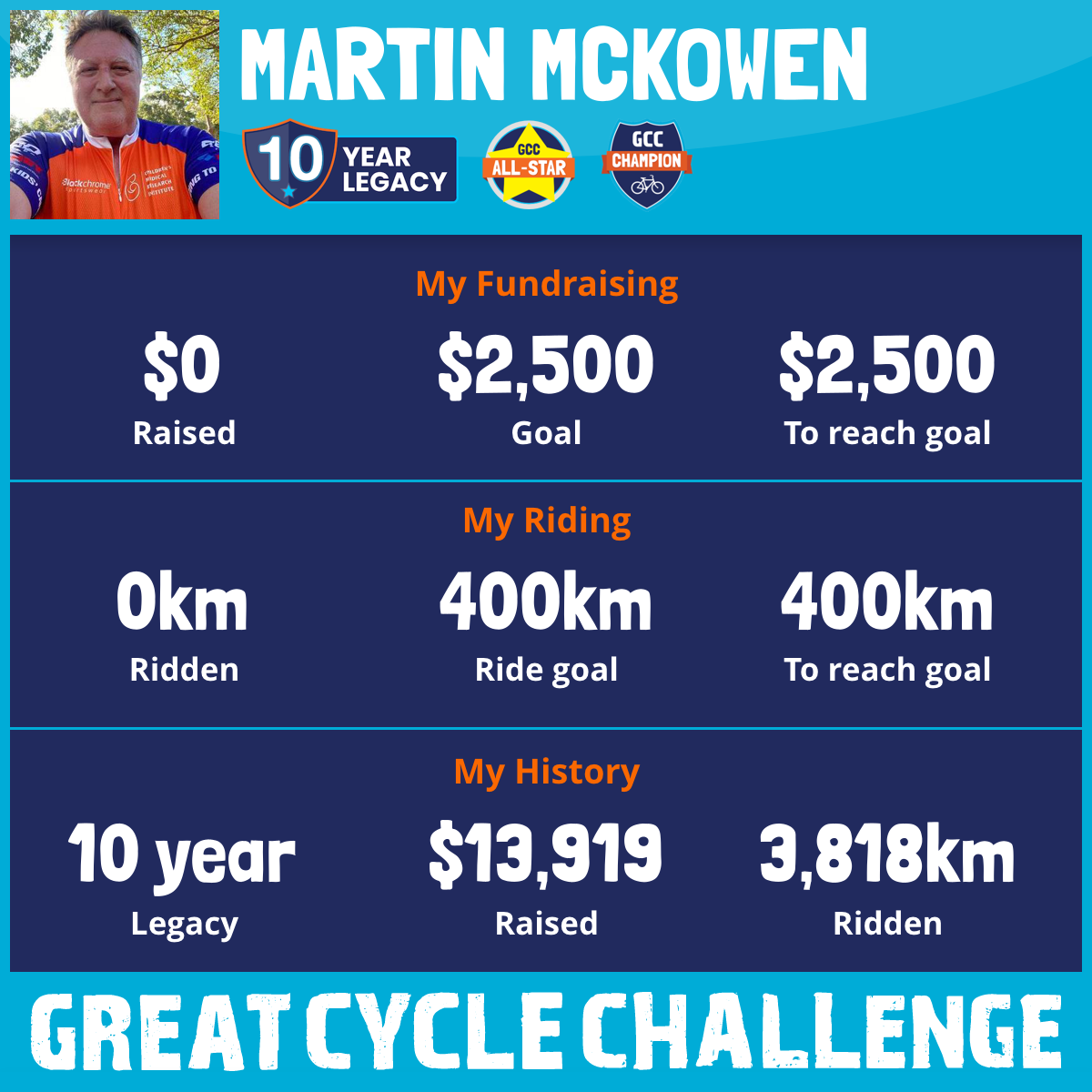 2025 marks my tenth year of participating in the Great Cycle Challenge to support kids' cancer research this October! This is my TENTH year of riding to raise awareness and funds for this fantastic cause. And my TENTH year of unapologetically asking and begging for money for this cause. I have ridden 3,934 km during this time, and you have donated $14,026.36. This is a good number, but kids keep getting sick with cancer. Hence, I continue to beg, cajole, and request donations.