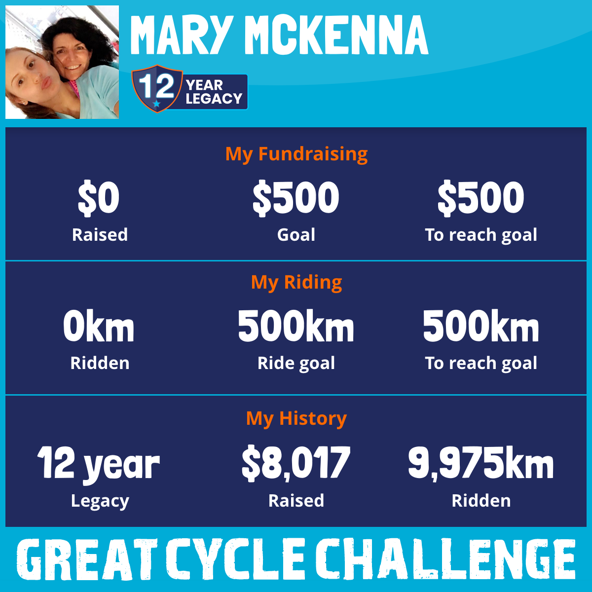 I am riding 500 km in memory of my friend, Christine Eivers & Kylie Thompson Tiana Mangsbais. Please sponsor me and support my challenge to fight kids' cancer and save little lives.