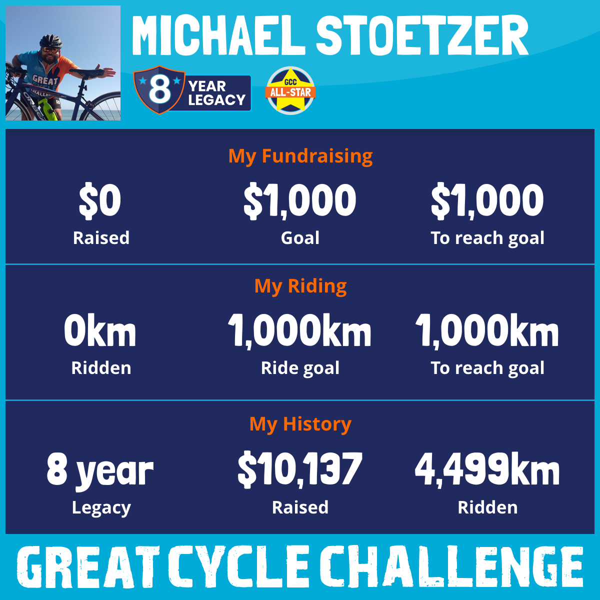 Join me in the fight against childhood cancer! For the eighth year in a row, I'm cycling in the Great Cycle Challenge to support the Children's Medical Research Institute. Every dollar counts towards finding a cure for this devastating disease that affects over 600 Australian children annually. Let's give these kids the brighter futures they deserve. Donate today and help make a difference.