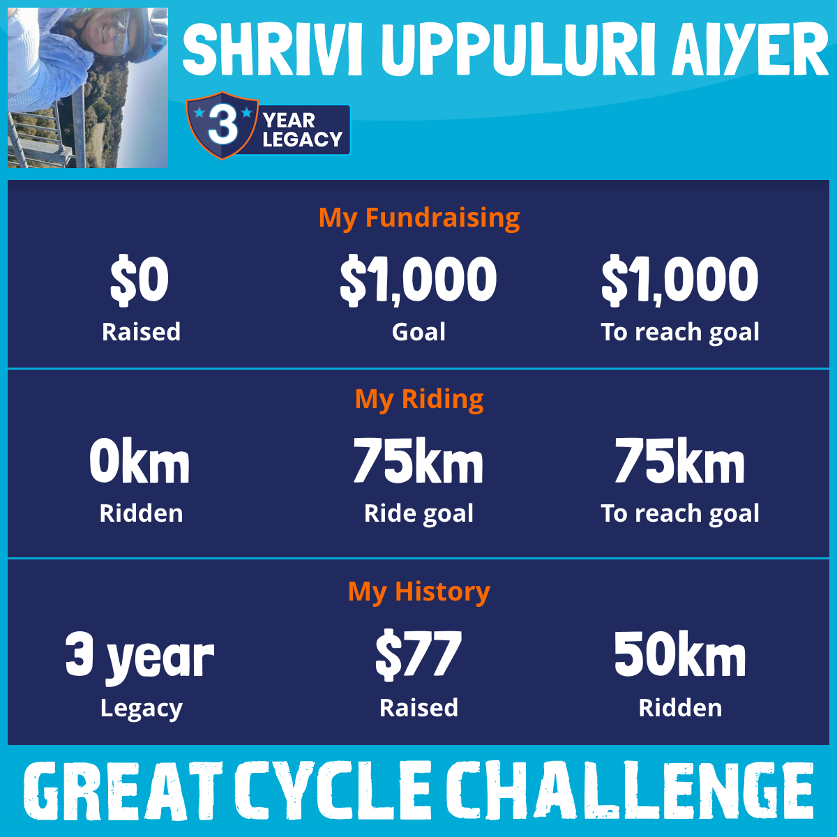 I've raised $0 My goal is $1,000 Donate Now