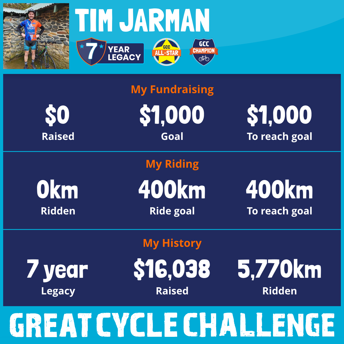 As with every year, I'm riding and pushing myself physically to support the amazing work that CMRI do to research treatments and cures for kids cancer. As a survivor of cancer I know that no child should have to experience this terrible disease, and as a dad of two wonderful kids I can't imagine what it must be like to have a son or daughter diagnosed with cancer at such a young age. Please support my challenge by making a donation through my fundraising page to give these kids the brighter futures they deserve.